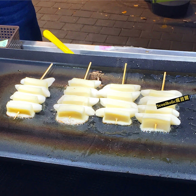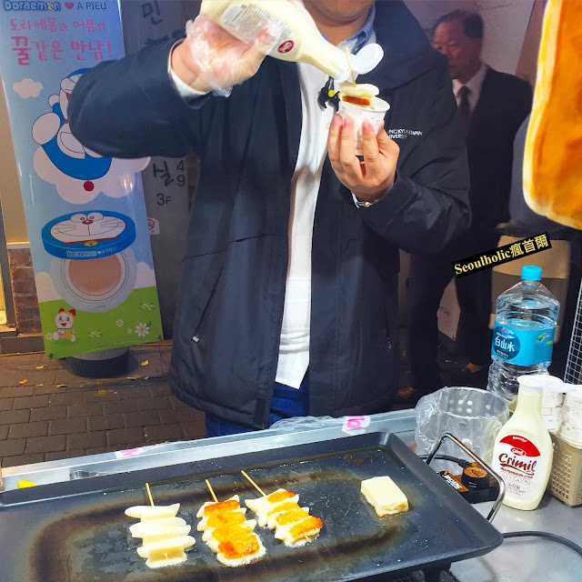 在明洞大街上,有一檔年糕芝士串小食,看起來很誘人呀!!